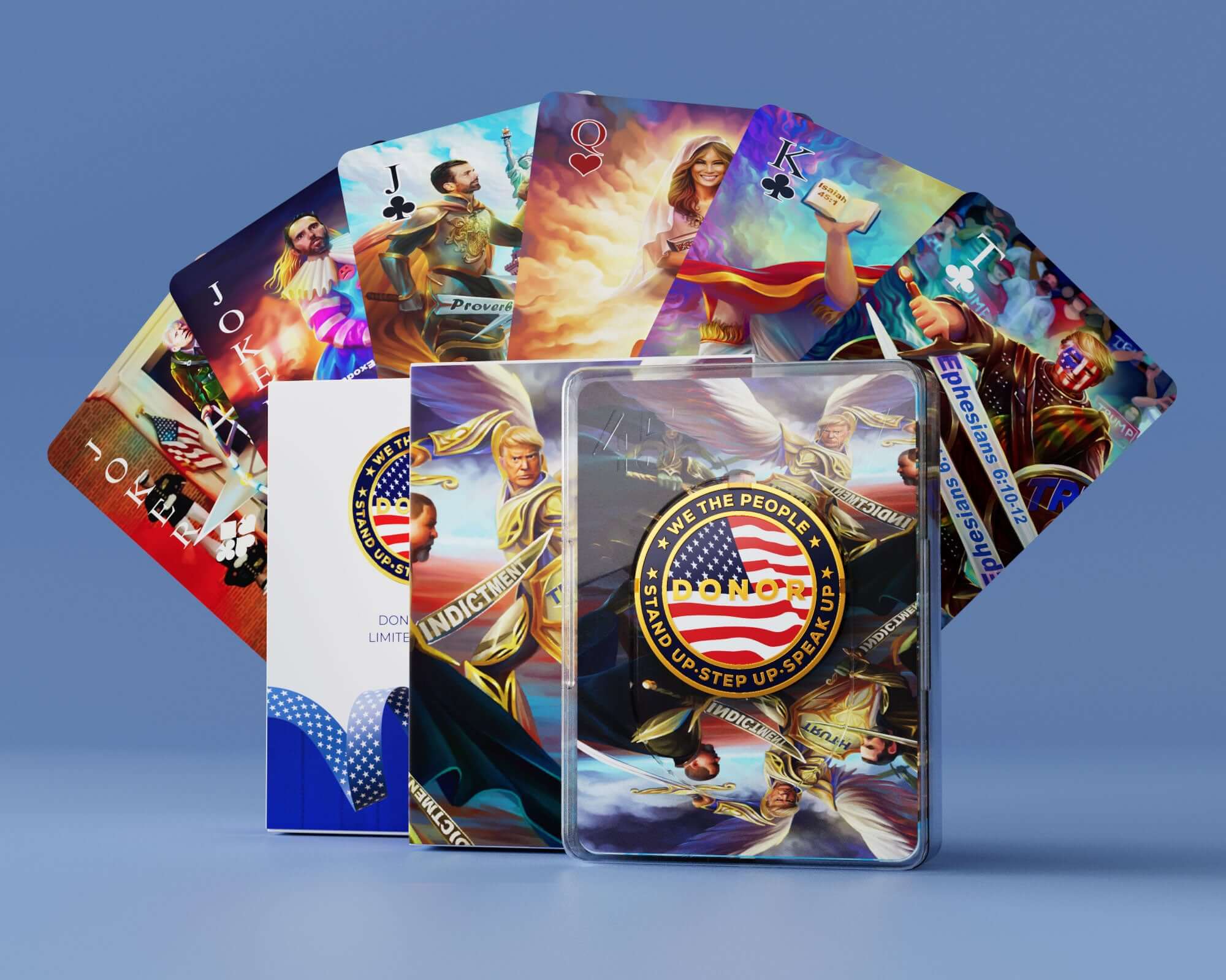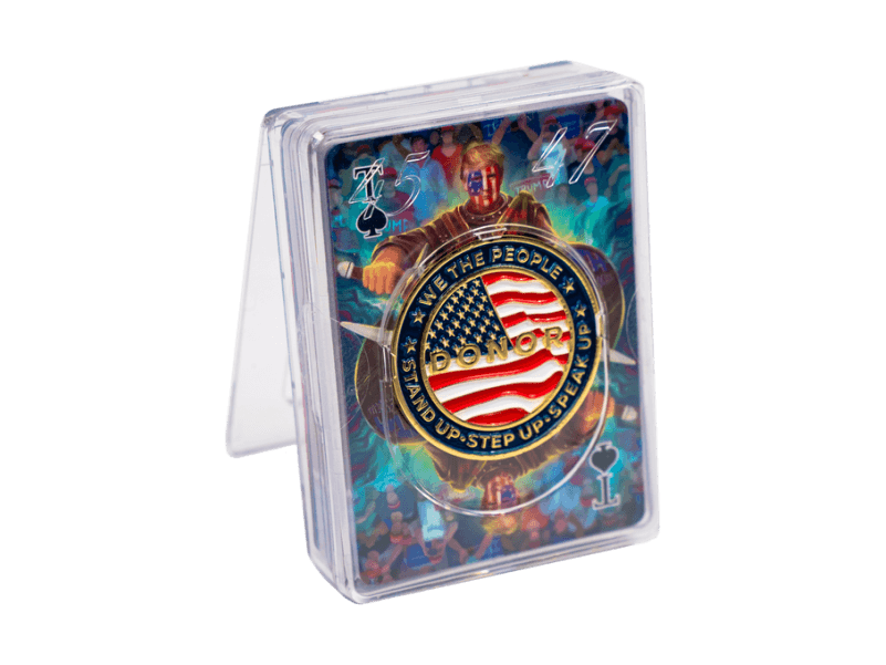 Elevate your collection with the Trump Donor Legacy Coin & Collector’s Card Set—an exclusive combination that includes a finely crafted Trump Donor Legacy Coin and a hand-illustrated Collector’s Card Deck, all presented in a stunning display case. The heavy, meticulously detailed Legacy Coin embodies Trump’s enduring legacy, celebrating both his 45th and 47th presidencies.