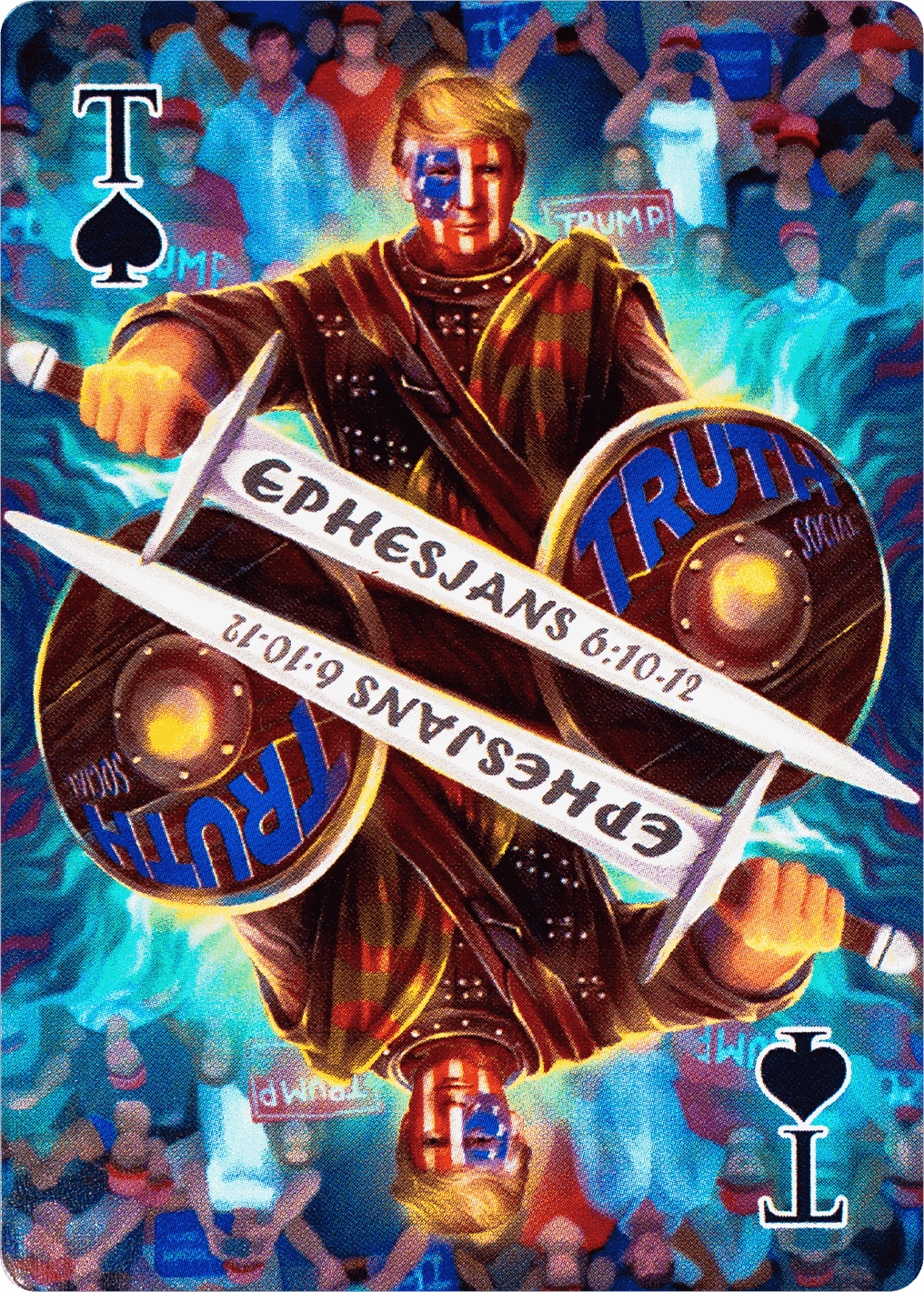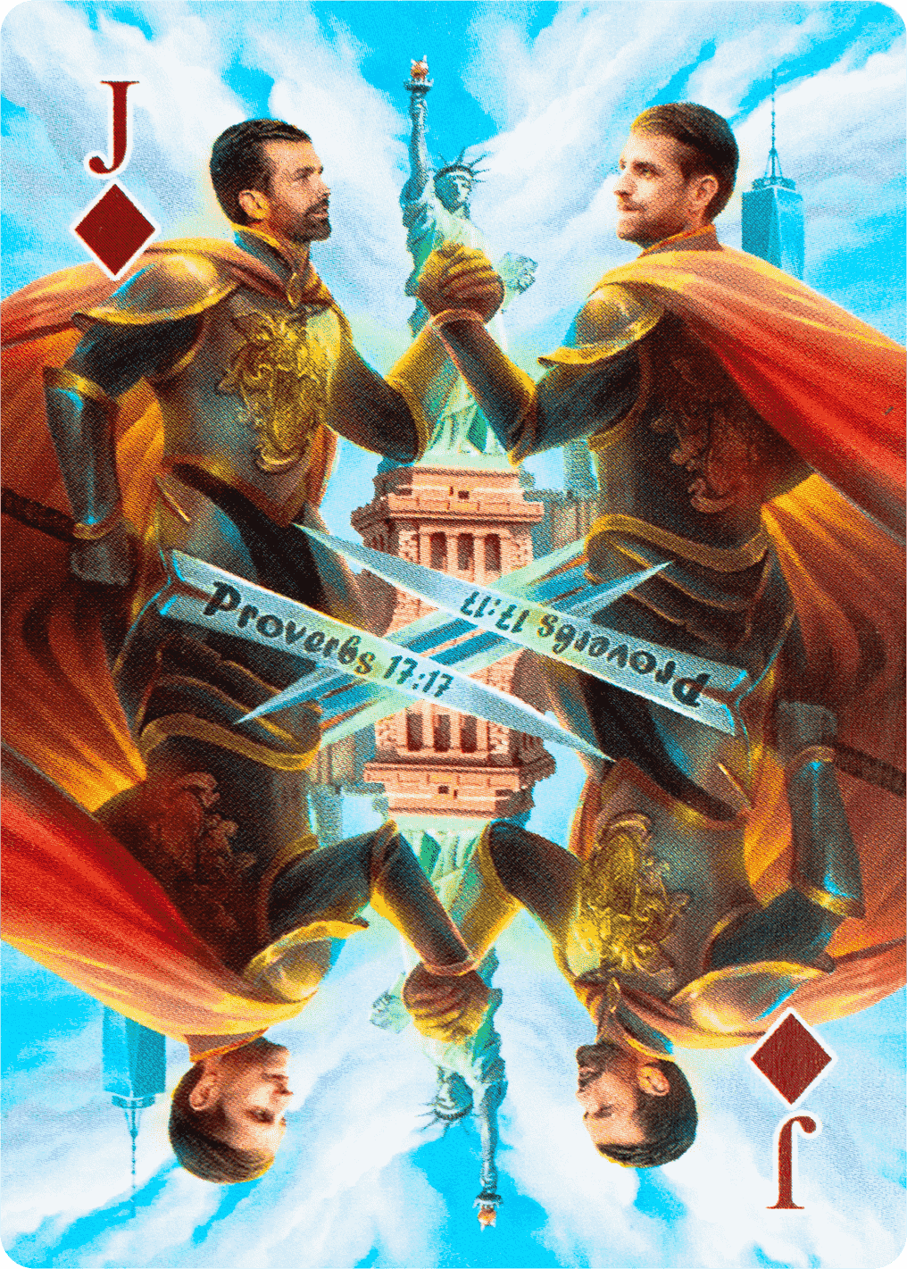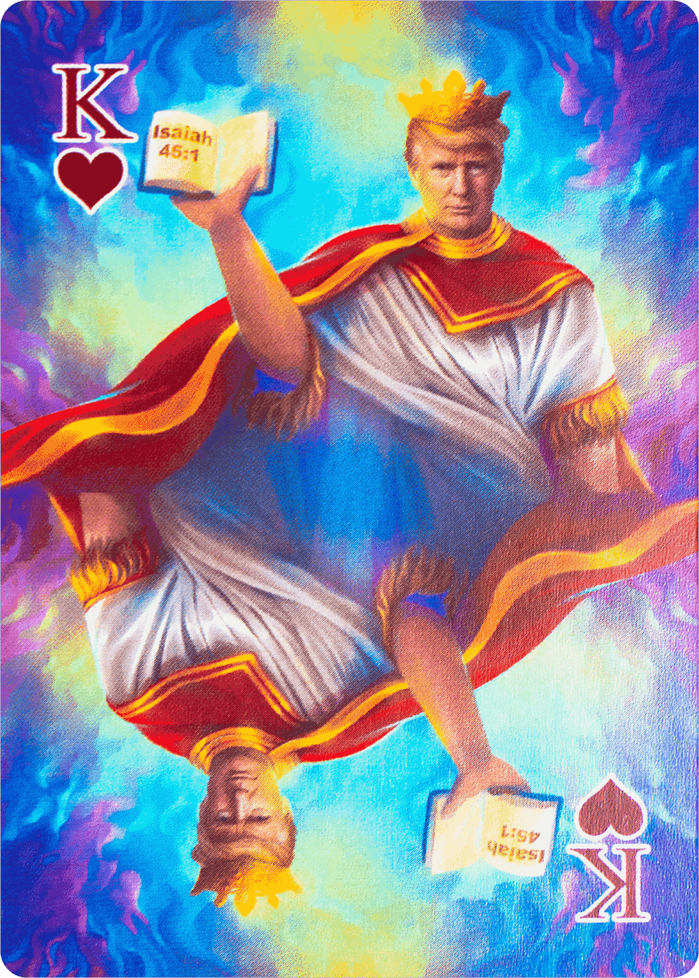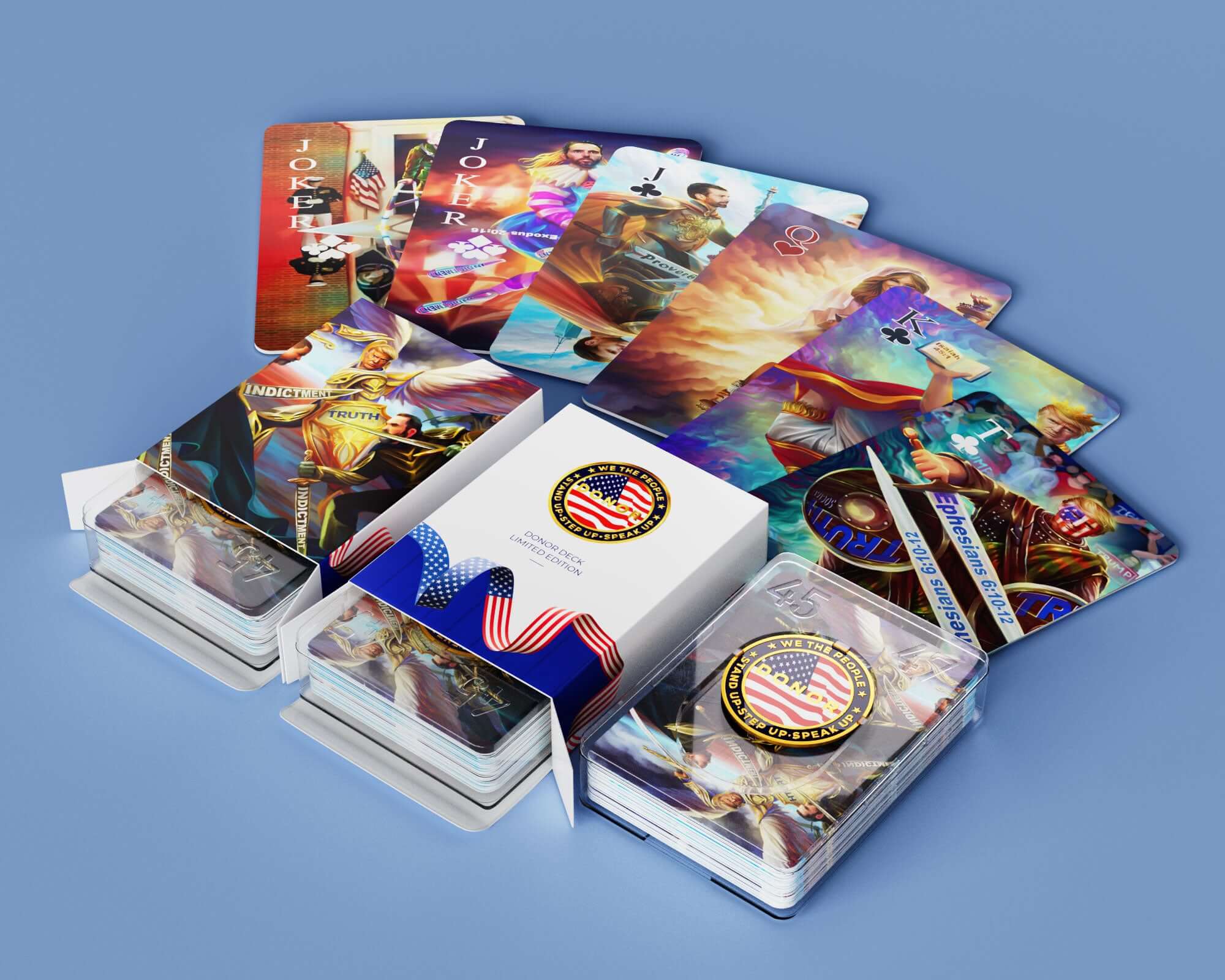 This unique set also features a beautifully designed deck of playing cards, each card brimming with symbolic, hand-drawn artwork of the Trump family. Together, they honor patriotism and the strength of American ideals. Displayed in a case emblazoned with “45” and “47,” this collectible set is a powerful tribute to tradition, history, and unwavering American pride.